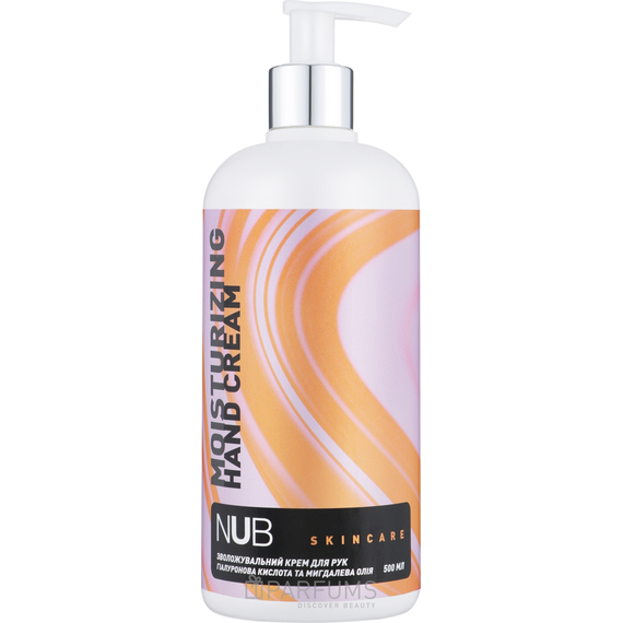 Moisturizing hand cream NUB Moisturizing Hand Cream Almond, 500 mlNUB Moisturizing Hand Cream Almond saturates the epidermis with moisturizing ingredients, instantly eliminating flaking and feeling of tightness. Almond extract includes vitamin E and provitamin A, essential for maintaining skin health, which have nourishing, regenerating and regenerating properties. With a light texture with an unobtrusive almond aroma, the cream is absorbed very quickly without leaving an unpleasant sticky film on the surface of the skin. How to use: Apply a small amount of cream to clean, dry skin of the hands and massage with light movements until completely absorbed.
