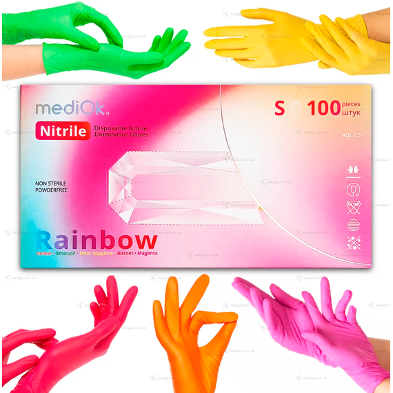 MediOk Rainbow nitrile gloves size S are a bright and practical solution to protect your hands. These colored gloves, in a pack of 100, are ideal for a variety of applications, from medical examinations to use in laboratories, beauty salons, as well as for general household needs.