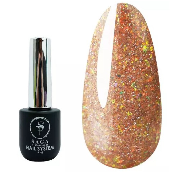 С новинкой от фирмы Saga в вашу жизнь ворвется яркий праздничный вихрь, ослепительный, сверкающий, словно феерверк. Этот гель-лак за счет плотности и насыщенности сияющими частичками очень напоминает жидкие блестки. Они красиво мерцают, переливаются и играют в лучах света. Эффект жемчуга, перламутра, сверкающего конфетти и волшебной голографии – это именно то, что способно превратить традиционный маникюрный дизайн в изысканно-праздничный и невероятно актуальный. Блестки снова на пике моды!