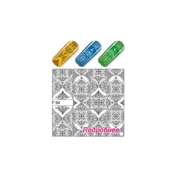 Слайдер дизайн -F94 Слайдер дизайн представляет собой достаточно легкий способ нанесения на ногти сложных фотографических рисунков. Слайдер дизайн - это тонкая эластичная пленочка с изображением, нанесенная на бумагу (бумага для удобства хранения и транспортировки). Такой способ декорирования ногтей очень прост, но эффект неповторимый. Благодаря огромному разнообразию цветов и рисунков, с помощью слайдер-дизайна можно создавать самые разные нейл-арты без особого труда. При правильном нанесении, такой дизайн достаточно стойкий.Технология нанесения слайдер дизайнов: На подготовленную ногтевую пластину нанесите базовое покрытие. Просушите в лампе. Нанесите цветное покрытие (лучше светлых оттенков). Просушите в лампе. Нанесите базу. Просушите в УФ-лампе 2 мин., в LED-30 секунд. Вырезанный рисунок, опустите в теплую воду на 20-30 секунд, пленка станет подвижной. Промокните лишнюю влагу салфеткой. Аккуратно сдвиньте изображение с бумажной основы. Приложите изображение на липкий слой, расположите его в нужном положении. Салфеткой разгладьте все неровности, и осторожно придавите. Если остались излишки плёнки, её можно удалить ножничками, а лишнее у свободного края убрать с помощью пилочки. Перекройте слайдер дизайн базой, просушите в лампе. Покройте топовым покрытием. Если топ, с липким слоем, снимите липкий слой. При правильном соблюдении всей технологии слайдер дизайн будет крепко держаться до 3-4 недель.