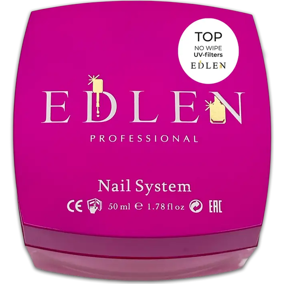 Top no wipe Edlen no UV-filters не изменяет цвет тёмного гель-лакового покрытия. Уникальная формула топа без UV-фильтров обеспечивает идеальную стойкость и прочность тёмного покрытия в течение 21 дня. Top no wipe Edlen no UV-filters сохраняет блеск и не затирается во время носки гель-лакового покрытия клиентом, придаёт красивый глянец и контраст покрытию. Несмотря на свою консистенцию, топ комфортен в работе, не затекает и хорошо самовыравнивается.