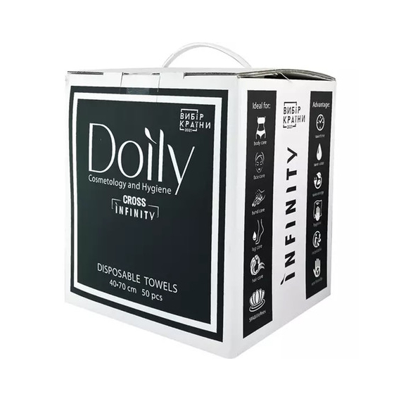Рушники Doily Cross Infinity в коробці — це практичний і гігієнічний вибір для салонів краси, спа, медичних установ, а також для домашнього використання. Кожен рушник має розмір 40 на 70 см, що робить його ідеальним для обличчя та рук.